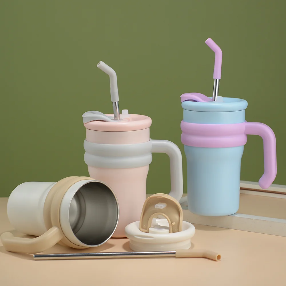 500ml 700ml Double Big Mouth Outdoor Thermal Insulated Stainless Steel Large Capacity Coffee Cup With Handle and Straw