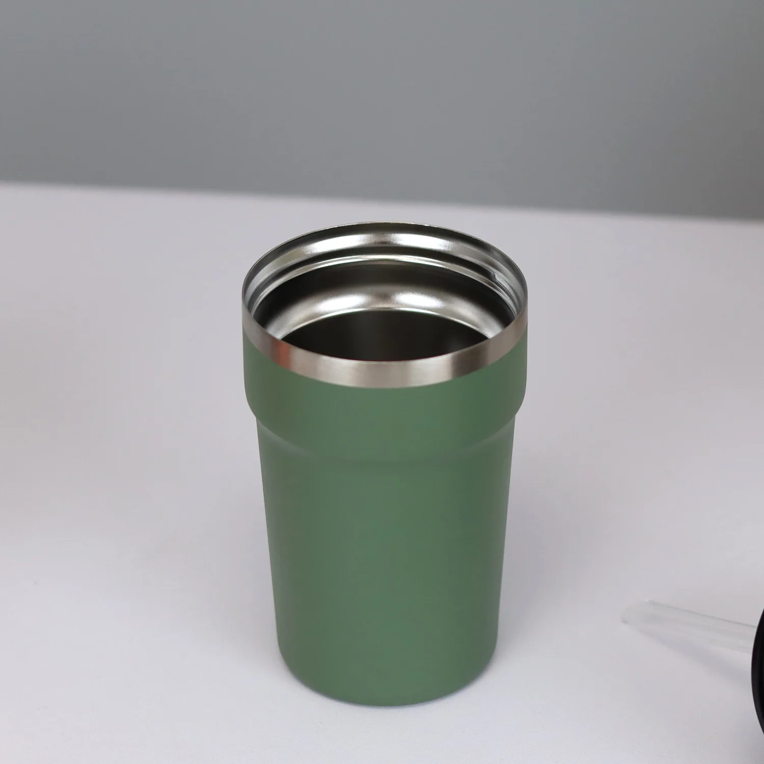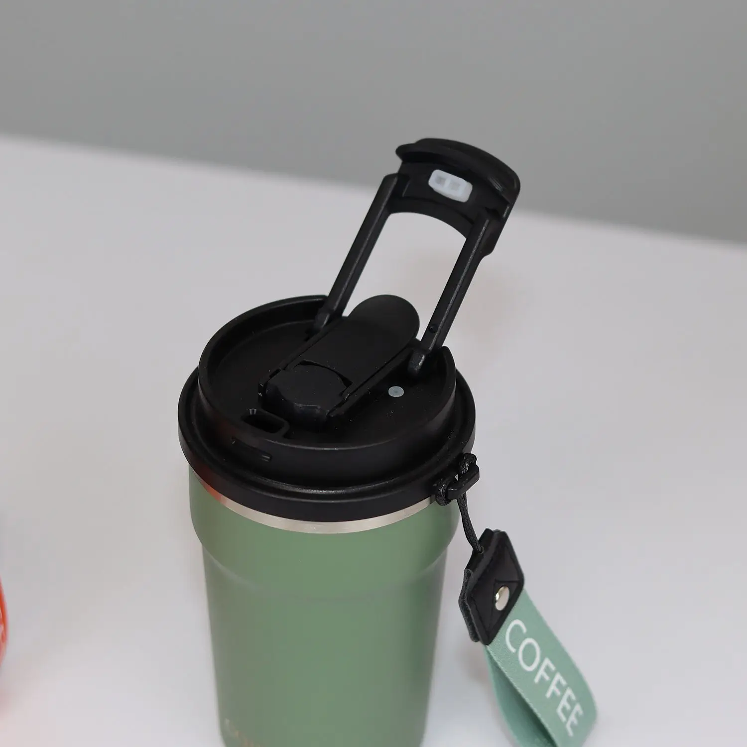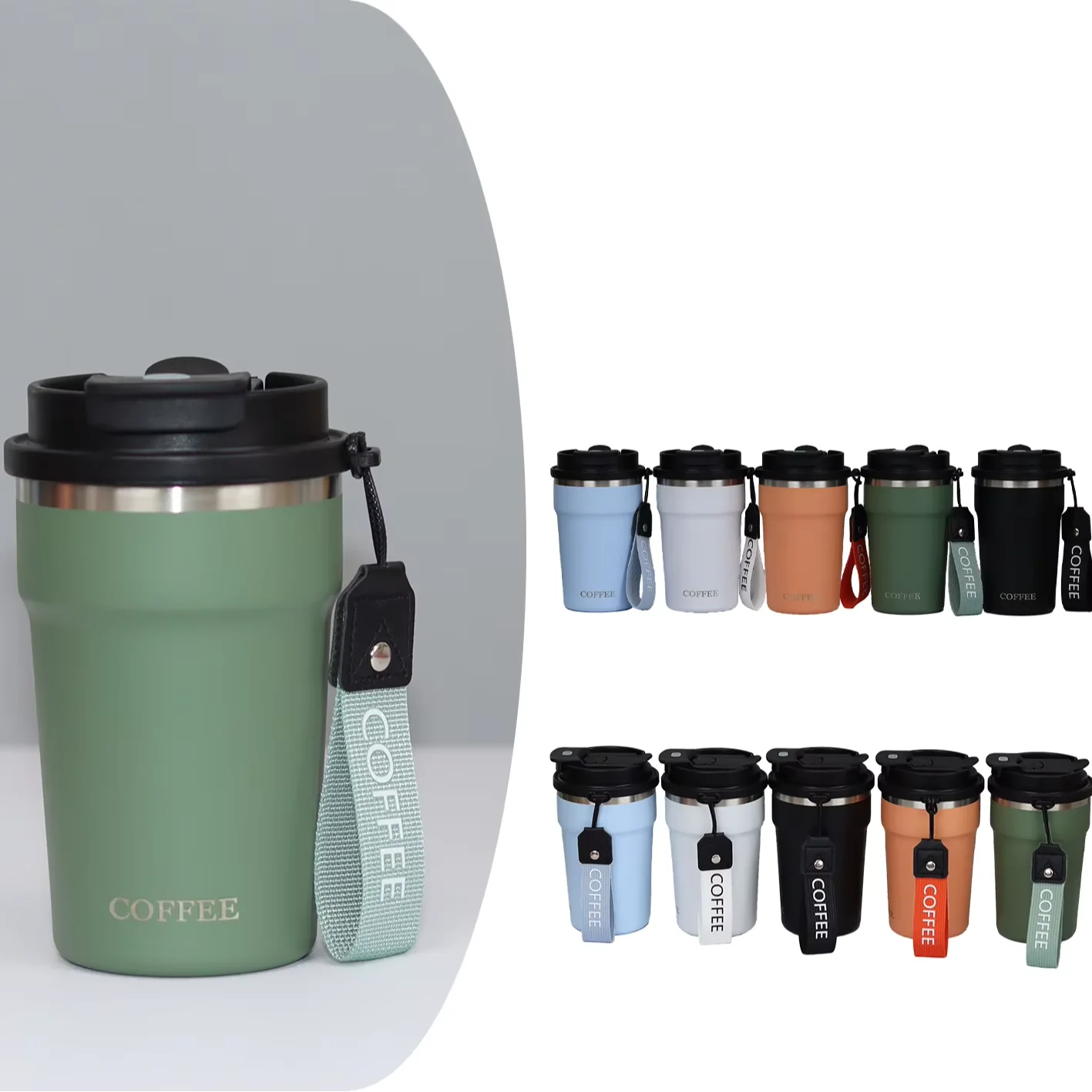 New Product Custom Logo 400ML Double Wall Stainless Steel Vacuum Insulated Coffee Cup with Filp Lid and Handle Strap